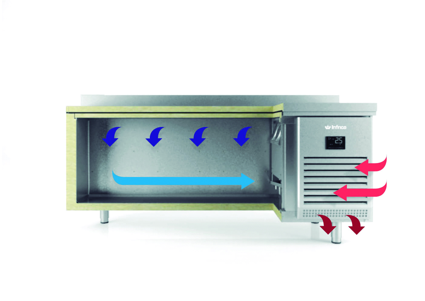 Cette desserte INFRICO de classification énergétique améliorée, grâce à l'utilisation du gaz réfrigérant R290, est destinée aux cuisines professionnelles. Elle est équipée de ventilateurs électroniques avec une circulation d'air optimisée qui garantissent une meilleure uniformité de la température à l'intérieur de l'enceinte. Avec son contrôleur numérique tactile et intuitif, la desserte réfrigérée offre une plus grande précision dans la maîtrise de la température afin de maintenir vos ingrédients frais. Son nouveau design de porte avec double poignée ajoutera une touche esthétique à votre cuisine.