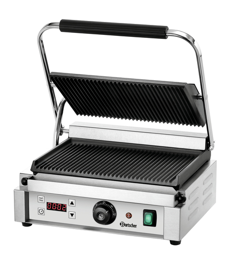 • Dimensions plaque grillade supérieure : L 340 x P 220 mm• Puissance : 2,2 kW | 230 V | 50/60 Hz• Matériau : Acier inoxydable• Remarque importante : -• Dimensions plaque grillade inférieure : L 345 x P 235 mm• Bac collecteur de graisse : Oui• Plage de température : de 50 °C à 300 °C• Commande : Manette - Bouton• Témoin lumineux de contrôle : Chauffe -Marche/arrêt• Réglage de la température : Thermostatique• Modèle de surface de grillade : Nervuré• Compris : 1 brosse de nettoyage• Matériau de grills : Fonte - Émaillé• Butée de la plaque supérieure réglable : Non