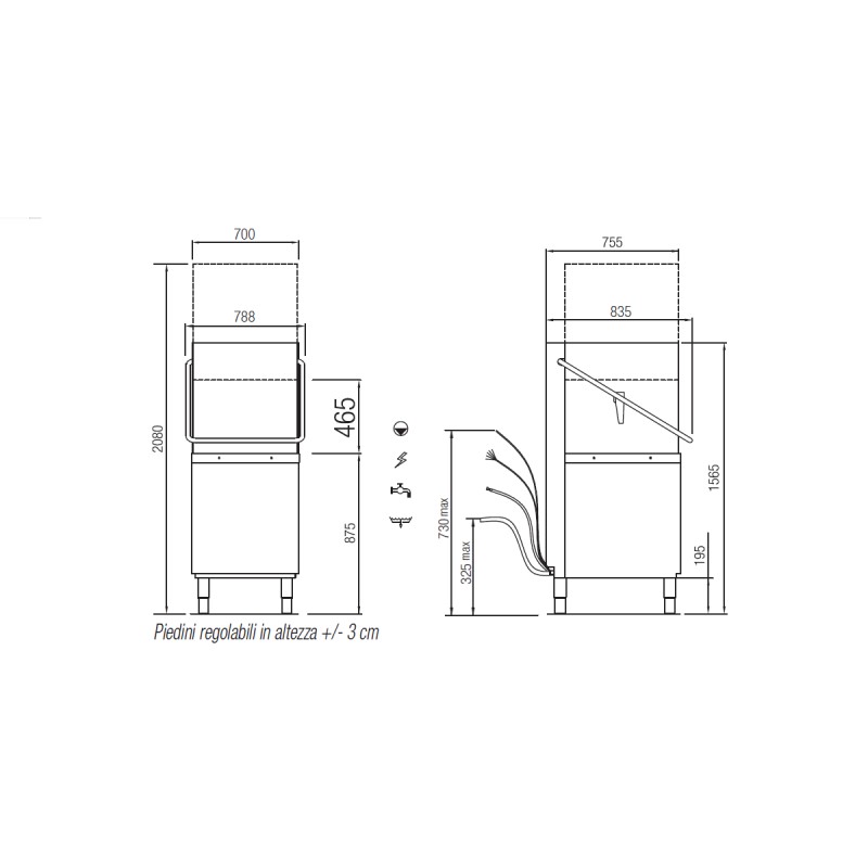 Il est équipé de commandes électroniques intégrant la technologie brevetée EVI® (Elettrobar Visual Interface), avec un affichage digital des informations essentielles : programme sélectionné, températures, état du cycle, codes erreurs et compteur de cycles. Les températures de lavage et de rinçage sont réglables, et la machine pilote le doseur de produit de rinçage. Une fonction économie d’énergie réduit automatiquement la température du surchauffeur à 65 °C lorsque la machine est à l’arrêt. Le tableau de commande bénéficie en plus d’une étanchéité IPX5.